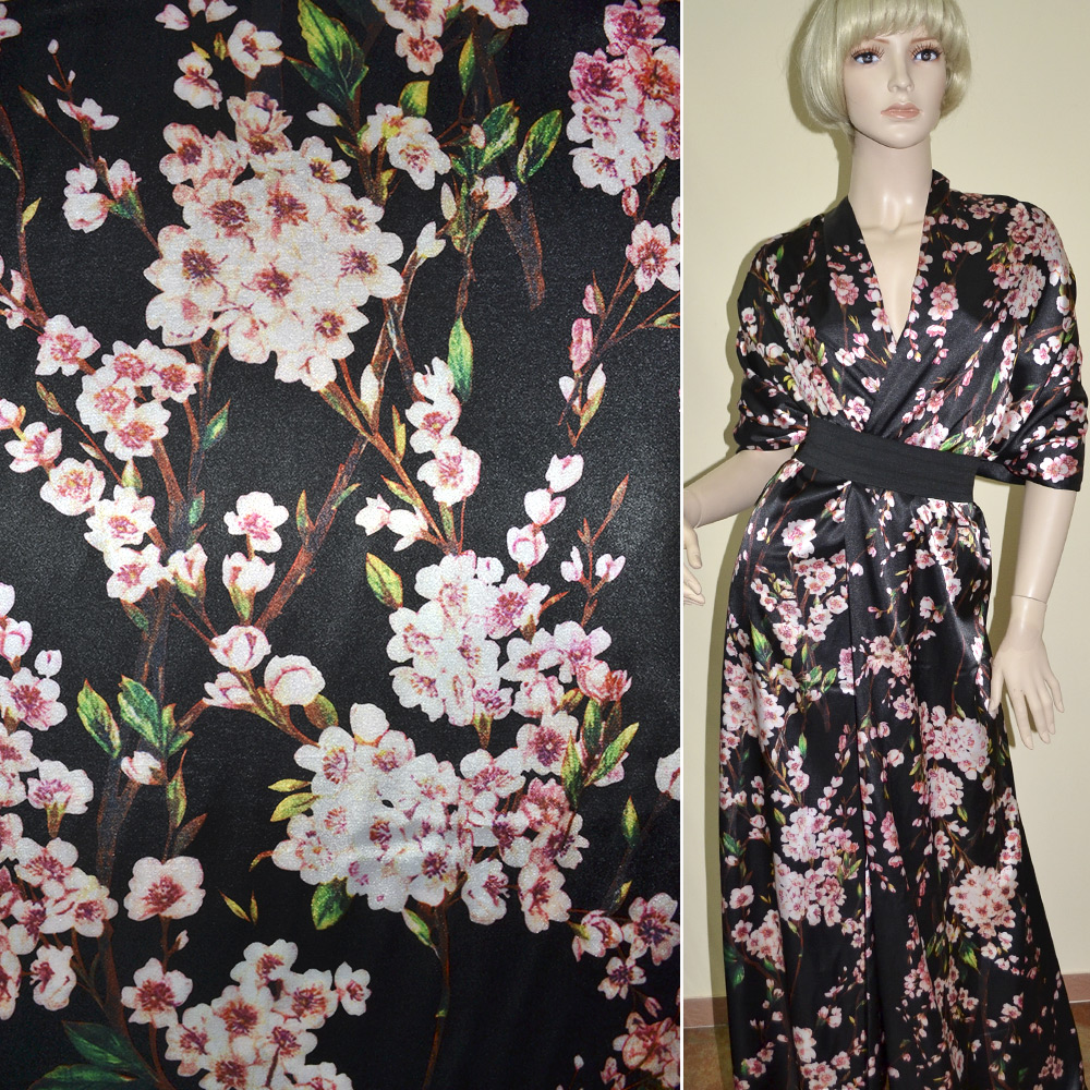 Атлас стрейч черный с цветущими веточками (принт) ш.150. Состав ткани: Полиэстер-97, Эластан-3. Плотность ткани: 90 г/м.кв. Страна производитель: Южная Корея. Атлас стрейч имеет гладкую блестящую атласную сторону и матовую изнанку. Ткань имеет плотное переплетение, одностороннее растяжение по ширине ткани. Содержание эластана делает возможность применить атлас для облегающей одежды. Эта ткань идеально подходит для платьев, блузок, белья, юбок, танцевальной одежды и многого другого. Атлас мягко драпируется, поэтому подходит для изготовления различных сложных моделей. Атлас доступен во многих цветах. Покупайте больше и экономьте больше, чтобы воспользоваться эксклюзивными скидками на количество ткани.