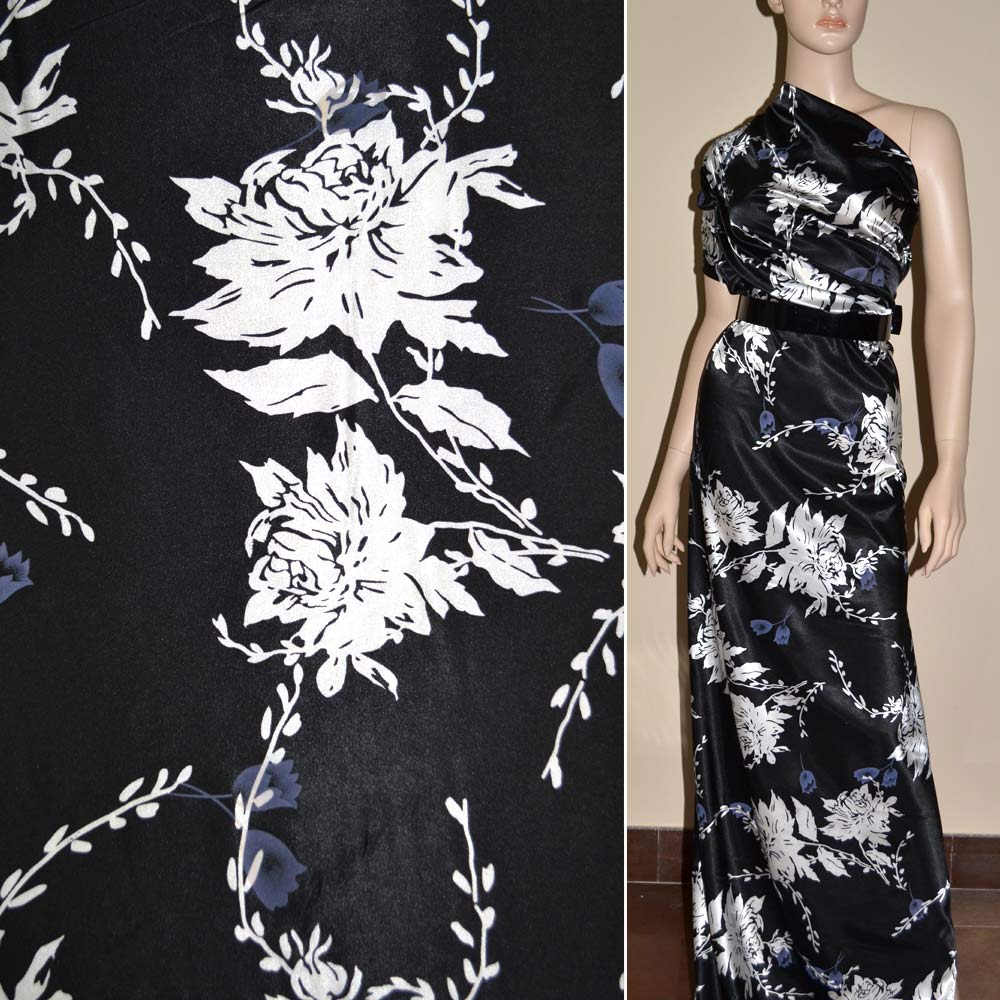 Атлас стрейч черный в белые цветы ш.120 купить в розницу и оптом