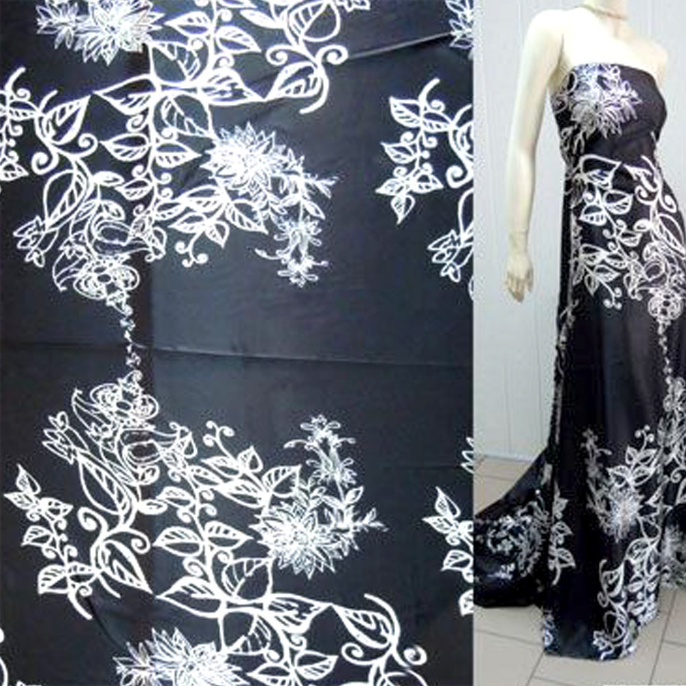 Атлас стрейч черный в белый цветочный орнамент ш.150 купить в розницу и оптом