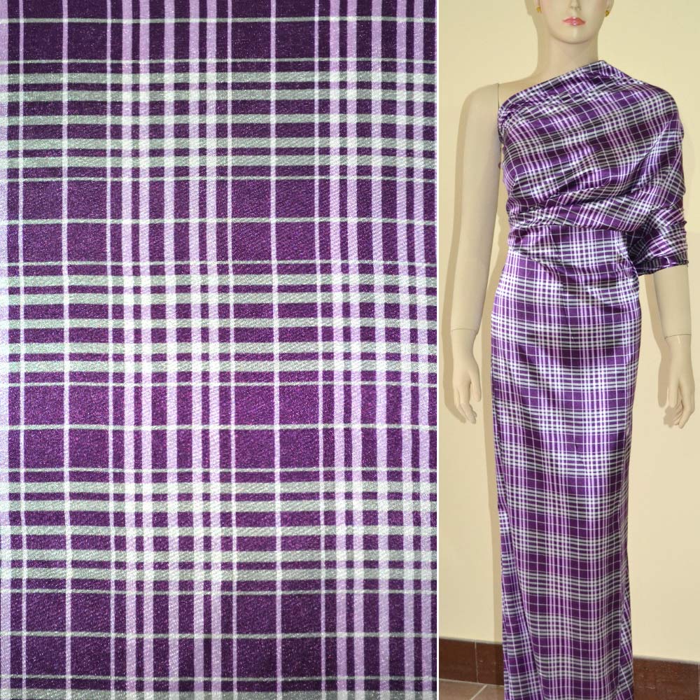 Атлас стрейч фиолетовый в серые и розовые квадраты ш.120 купить в розницу и оптом