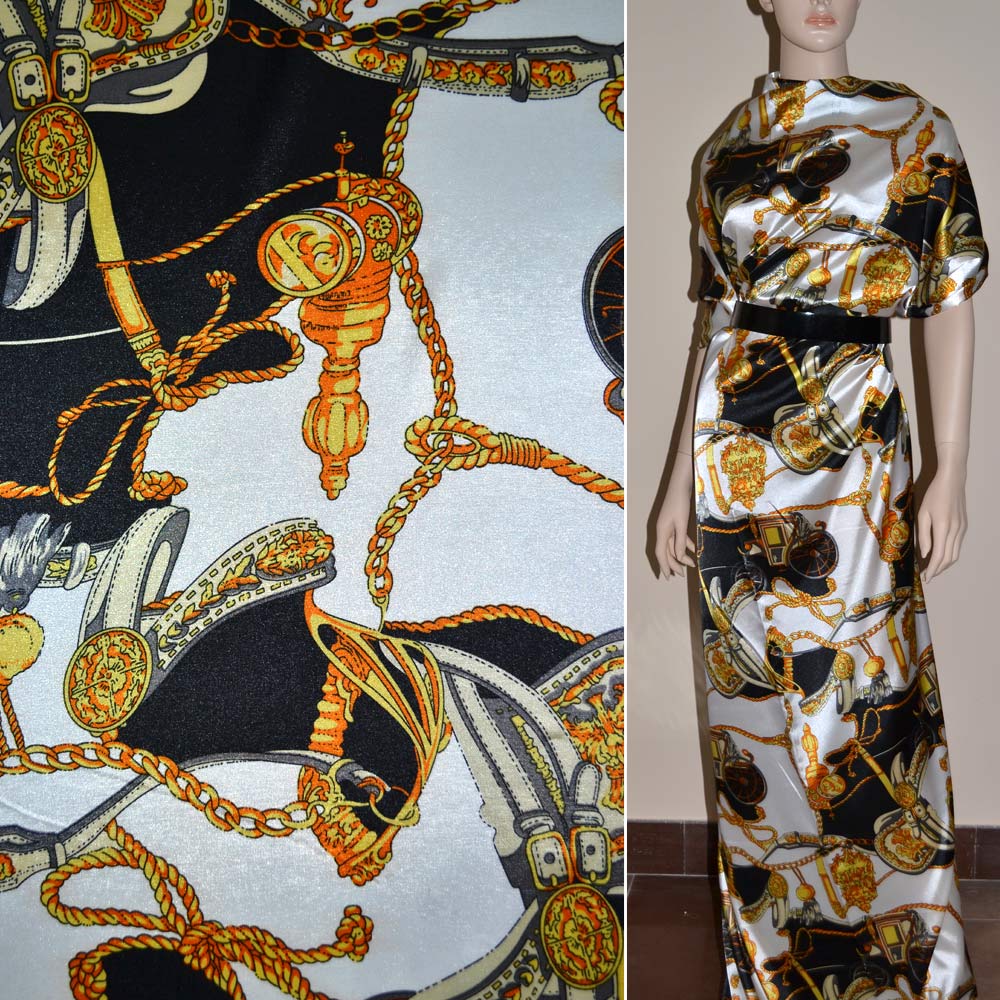 Атлас стрейч молочный с черными машинами и цепями ш.120. Состав ткани: Полиэстер-97, Эластан-3. Плотность ткани: 85 г/м.кв. Страна производитель: Южная Корея. Изделия, выполненные из атласа – будь то одежда или предметы интерьера - всегда смотрятся достойно и радуют глаз. Это плотная прочная ткань с шелковым благородным блеском. Имеет две стороны – гладкую лицевую и матовую изнаночную. Атлас имеет множество достоинств, такие как гигроскопичность, прочность, хорошая драпировка, воздухопроницаемость. Отлично сочетается с органзой, бархатом, шифоном, кружевом.