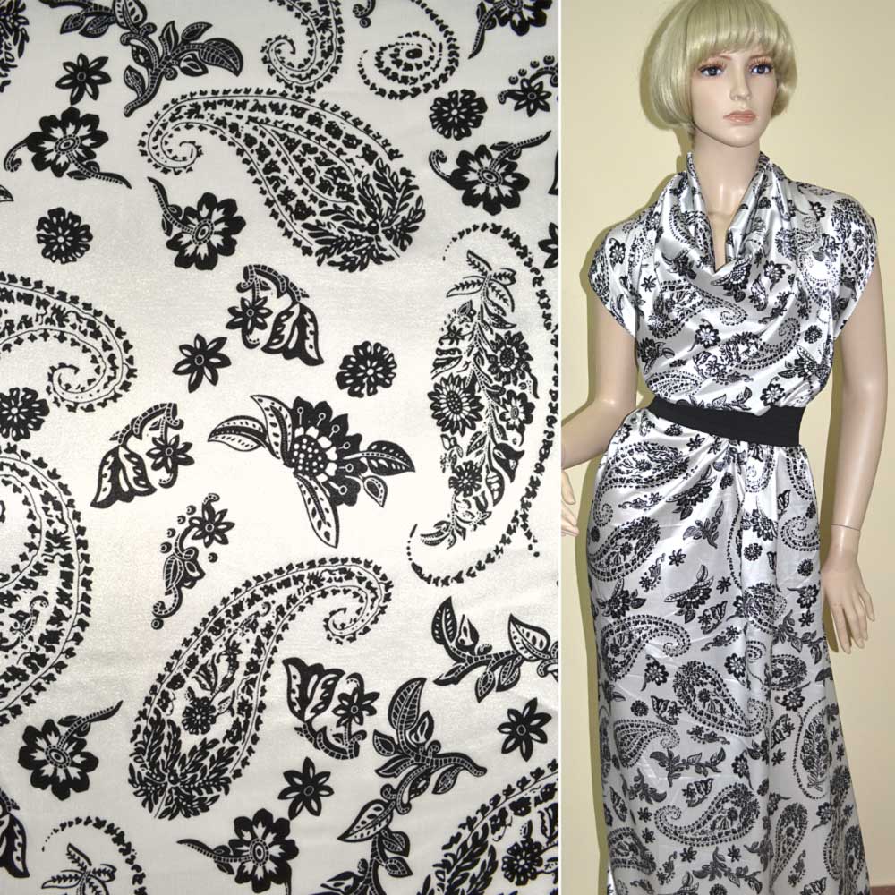 Атлас стрейч молочный с черными цветами и огурцами ш.120 купить в розницу и оптом