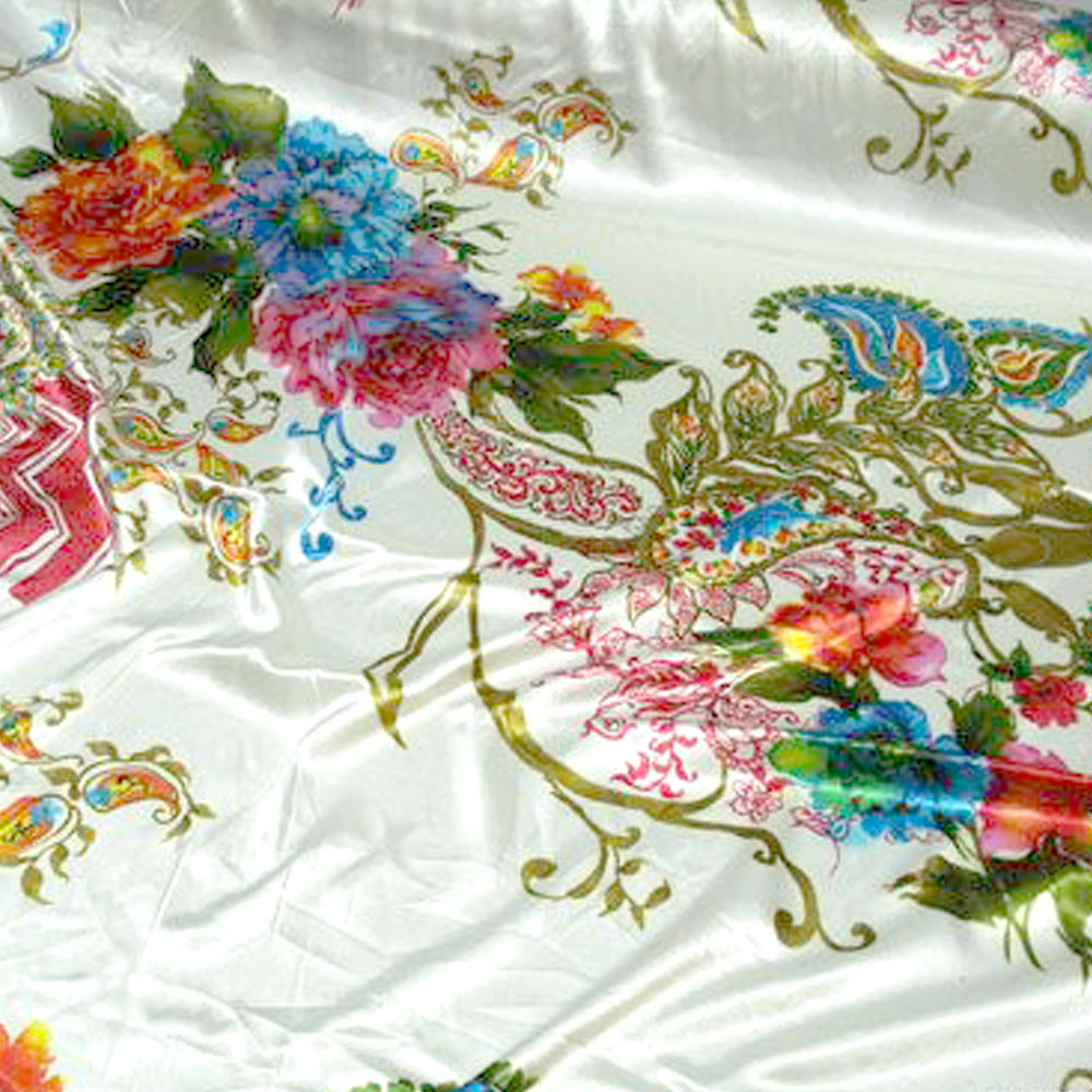 Атлас стрейч молочный с оранжево-синими цветами и огурцами ш.150. Состав ткани: Полиэстер-97, Эластан-3. Плотность ткани: 80 г/м.кв. Страна производитель: Южная Корея. Результатом атласного плетения является безупречная гладкость, блеск, крепость полотна. Атлас по характеристикам, внешнему виду напоминает натуральный шелк, но показатели плотности имеет более высокие. Наружная и внутренняя сторона выглядят по-разному. С изнанки материал не обладает блеском, на ощупь ощущается шероховатость. Атласный шелк широко применяется при изготовлении разнообразной одежды для женщин и мужчин. Из него шьют свадебные, вечерние и просто нарядные платья, блузы, рубашки, нижнее белье, постельное белье, делают аксессуары для волос, используют в качестве подкладки для шуб и пальто. Из атласного полотна изготавливают пуанты и декоративные ленты для отделки шляпок, штор и элементов одежды. Непрозрачный атлас хорошо скрывает солнечный свет, поэтому может использоваться при пошиве штор.