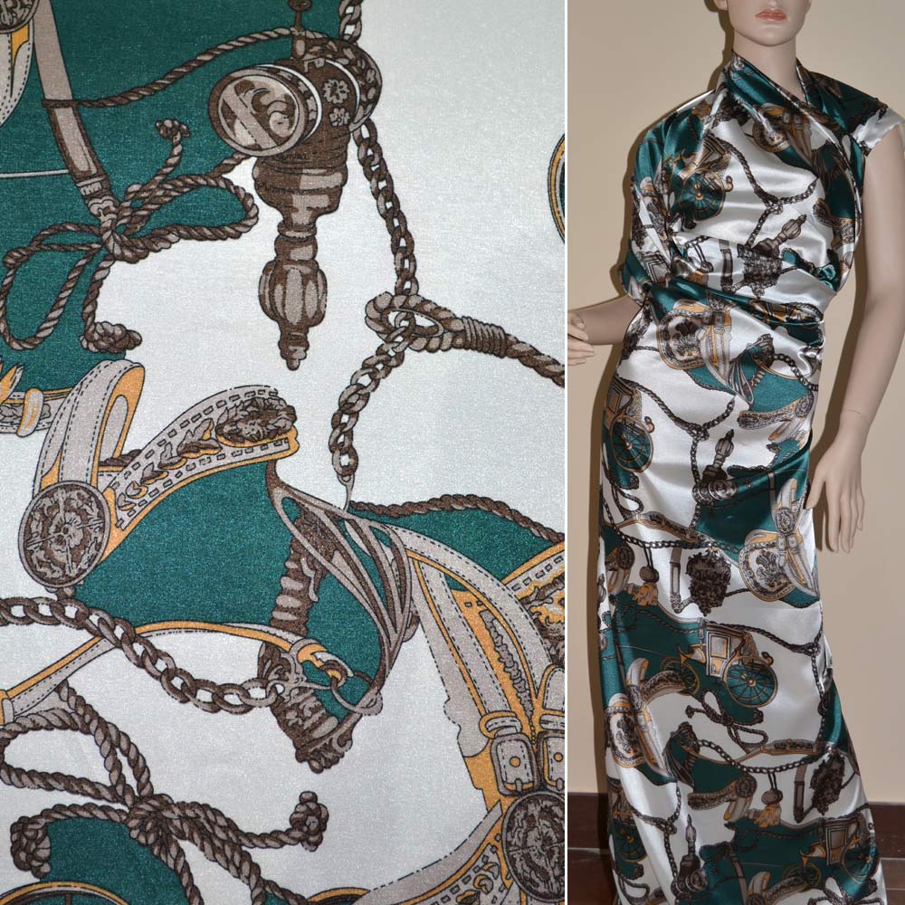 Атлас стрейч молочный с зелеными машинками и цепями ш.120. Состав ткани: Полиэстер-97, Эластан-3. Плотность ткани: 83 г/м.кв. Страна производитель: Южная Корея. Самой популярной тканью, которая используется при пошиве свадебных и вечерних платьев, вот уже много лет является атлас. С арабского языка это слово переводится как «гладкий» и оно с точностью характеризует внешний вид этого материала. Атлас представляет собой плотную шелковую или полушелковую ткань атласного переплетения, при котором нить утка выходит на лицевую сторону через пять и более нитей основы.