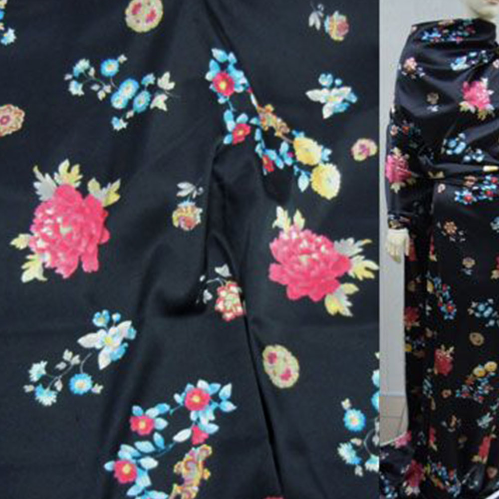 Атлас стрейч пионы, цветы мелкие черный ш.150 купить в розницу и оптом