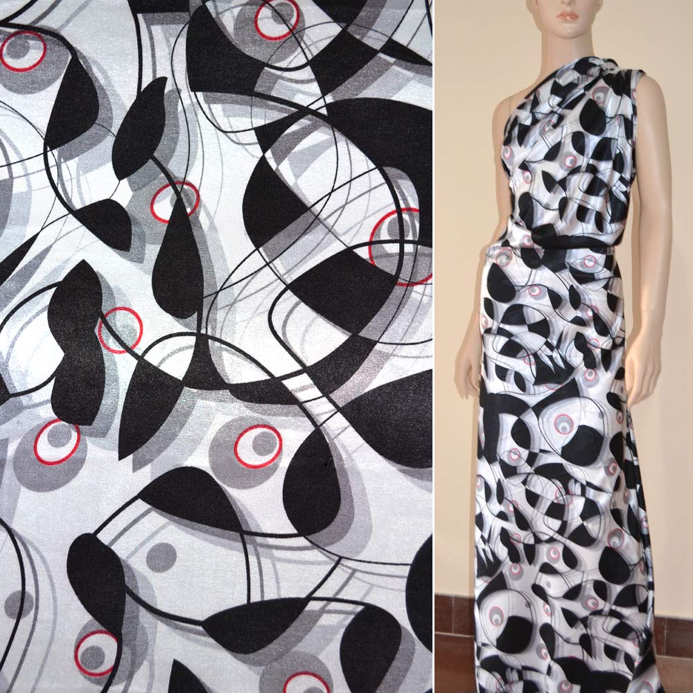 Атлас стрейч шамус белый в черно-красный абстрактный рисунок ш.150. Состав ткани: Полиэстер-97, Эластан-3. Плотность ткани: 80 г/м.кв. Страна производитель: Южная Корея. Атлас стрейч имеет гладкую блестящую атласную сторону и матовую изнанку. Ткань имеет плотное переплетение, одностороннее растяжение по ширине ткани. Содержание эластана делает возможность применить атлас для облегающей одежды. Эта ткань идеально подходит для платьев, блузок, белья, юбок, танцевальной одежды и многого другого. Атлас мягко драпируется, поэтому подходит для изготовления различных сложных моделей. Атлас доступен во многих цветах. Покупайте больше и экономьте больше, чтобы воспользоваться эксклюзивными скидками на количество ткани.