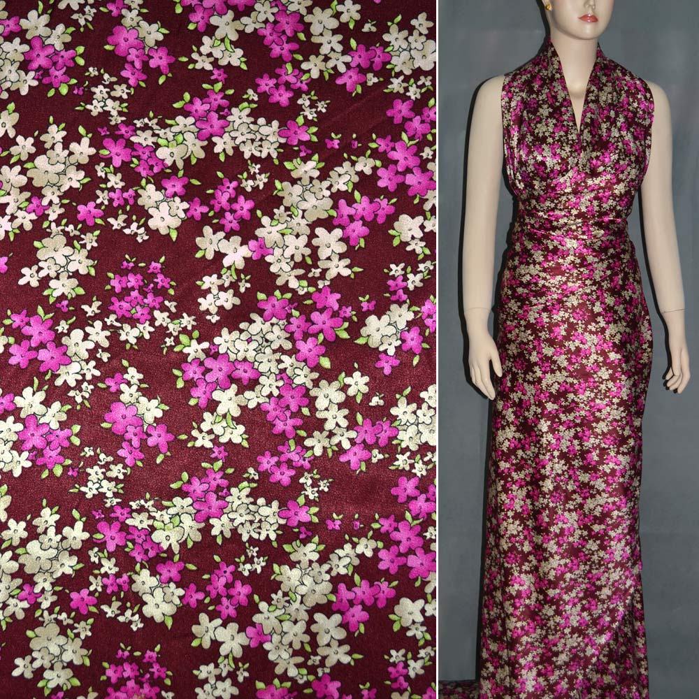 Атлас стрейч шамус бордовый с малиново-кремовыми цветами ш.150 купить в розницу и оптом