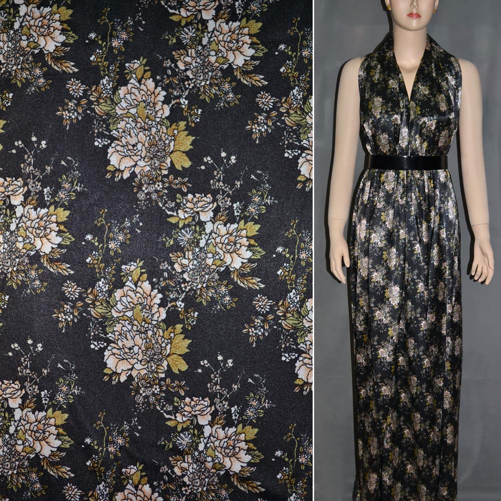 Атлас стрейч шамус черный в бежевые букеты ш.120 купить в розницу и оптом