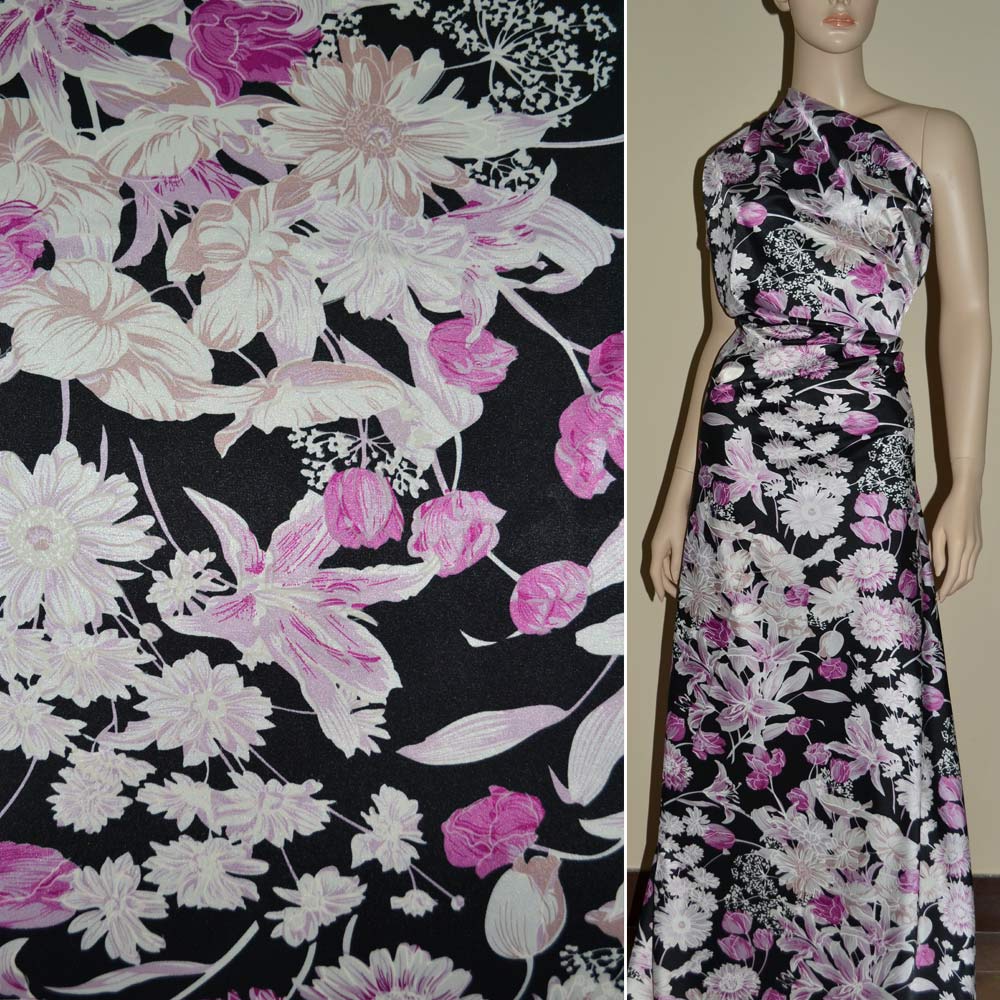 Атлас стрейч шамус черный в розово-белый цветок ш.120 купить в розницу и оптом