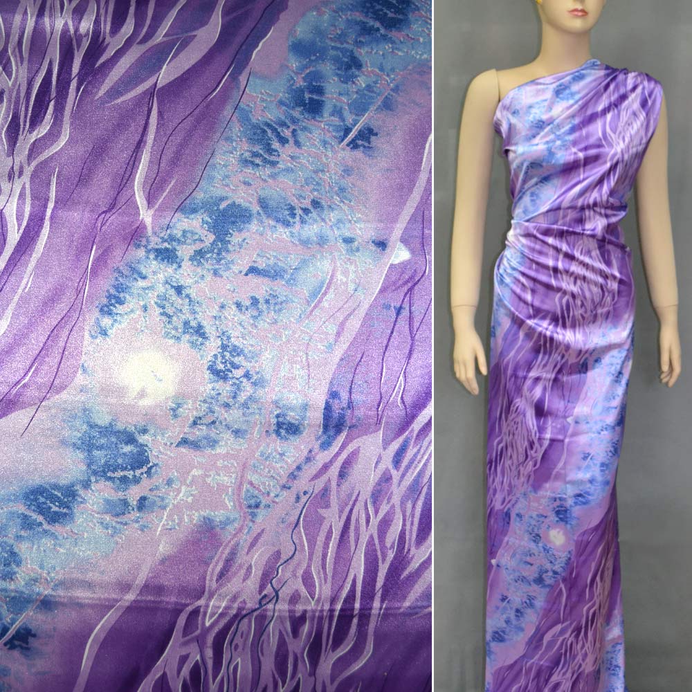 Атлас стрейч шамус фиолетовый в голубой абстрактный рисунок ш.120. Состав ткани: Полиэстер-97, Эластан-3. Плотность ткани: 85 г/м.кв. Страна производитель: Южная Корея. Атлас стрейч шамус имеет гладкую блестящую атласную сторону и матовую изнанку. Ткань имеет плотное переплетение, одностороннее растяжение по ширине ткани. Содержание эластана делает возможность применить атлас для облегающей одежды. Эта ткань идеально подходит для платьев, блузок, белья, юбок, танцевальной одежды и многого другого. Атлас мягко драпируется, поэтому подходит для изготовления различных сложных моделей. Атлас доступен во многих цветах. Покупайте больше и экономьте больше, чтобы воспользоваться эксклюзивными скидками на количество ткани.