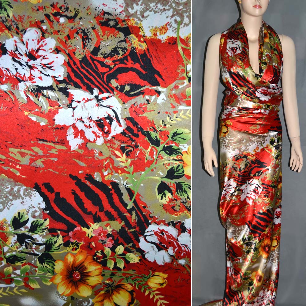 Атлас стрейч шамус красно-серый с желтыми цветами ш.120 купить в розницу и оптом