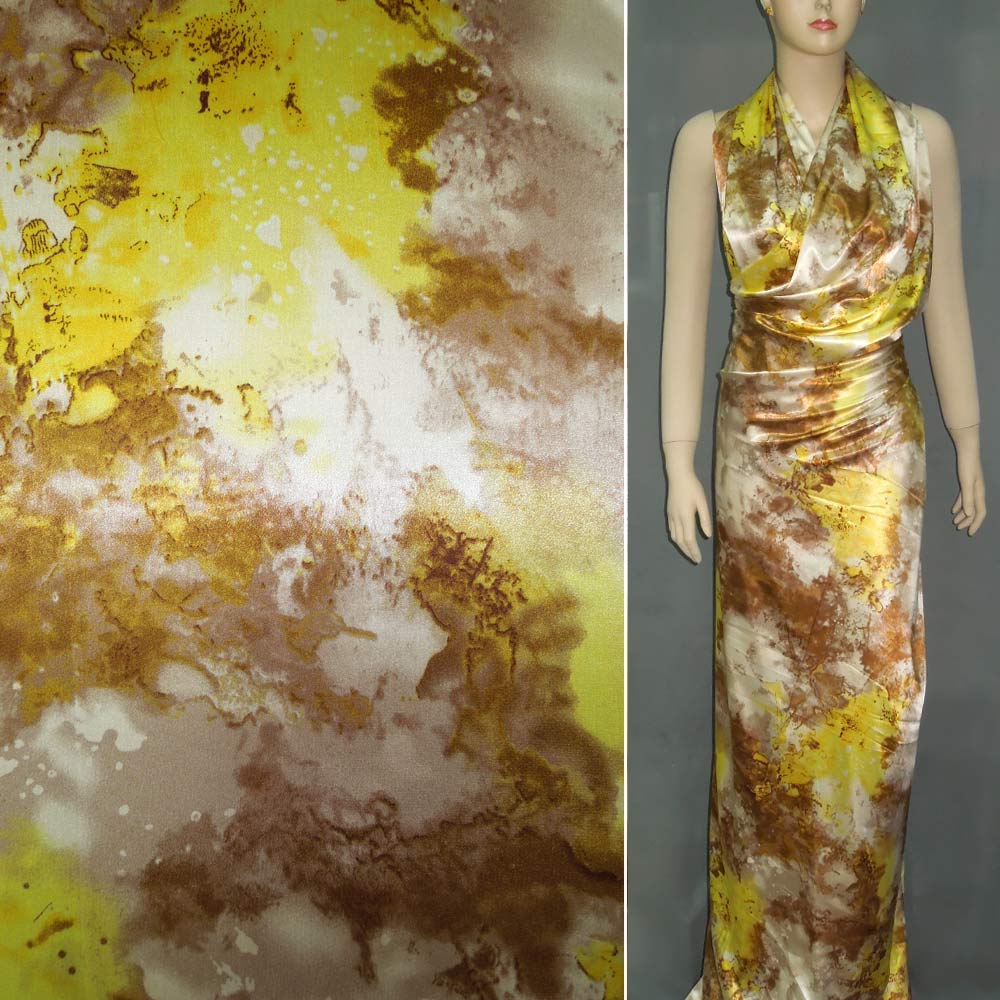 Атлас стрейч светло-коричневый с желтой абстракцией рисунок ш.150. Состав ткани: Полиэстер-97, Эластан-3. Плотность ткани: 85 г/м.кв. Страна производитель: Южная Корея. Результатом атласного плетения является безупречная гладкость, блеск, крепость полотна. Атлас по характеристикам, внешнему виду напоминает натуральный шелк, но показатели плотности имеет более высокие. Наружная и внутренняя сторона выглядят по-разному. С изнанки материал не обладает блеском, на ощупь ощущается шероховатость. Атласный шелк широко применяется при изготовлении разнообразной одежды для женщин и мужчин. Из него шьют свадебные, вечерние и просто нарядные платья, блузы, рубашки, нижнее белье, постельное белье, делают аксессуары для волос, используют в качестве подкладки для шуб и пальто. Из атласного полотна изготавливают пуанты и декоративные ленты для отделки шляпок, штор и элементов одежды. Непрозрачный атлас хорошо скрывает солнечный свет, поэтому может использоваться при пошиве штор.