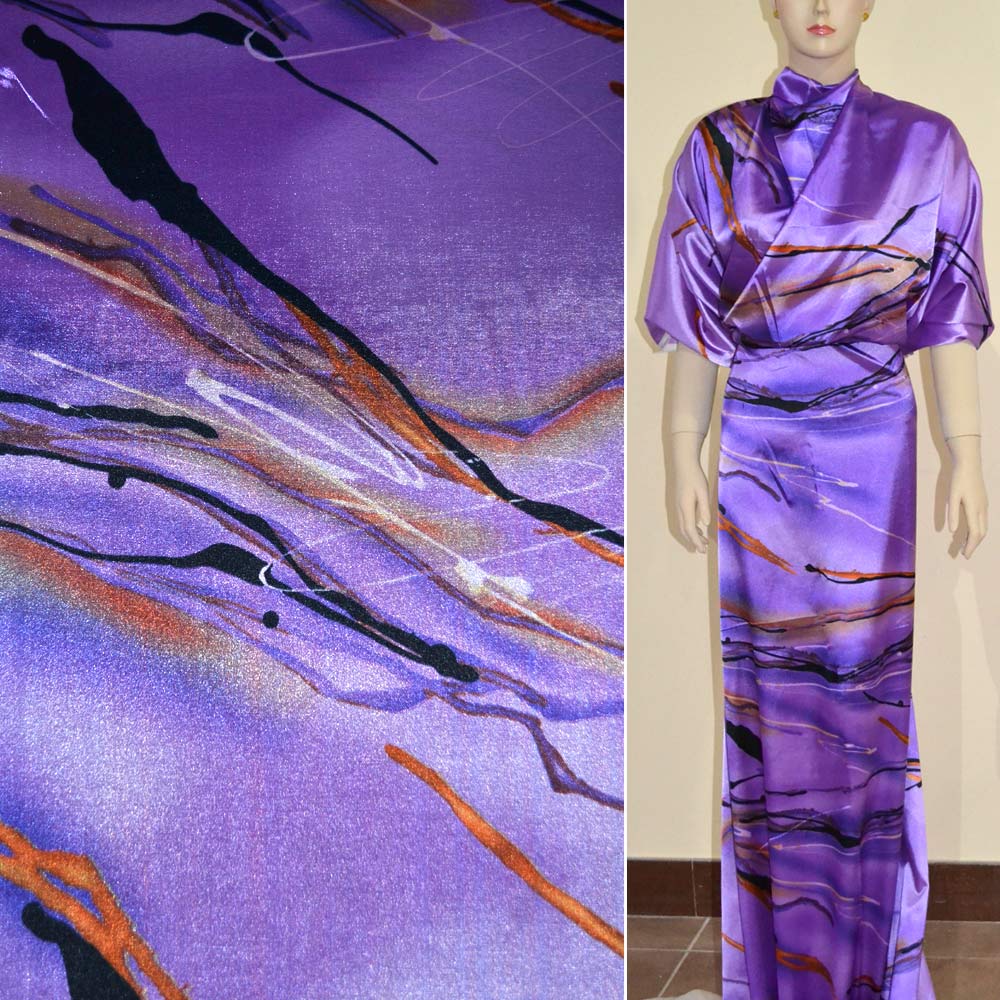 Атлас стрейч светло-сиреневый в черно-оранжевые разводы ш.150 купить в розницу и оптом