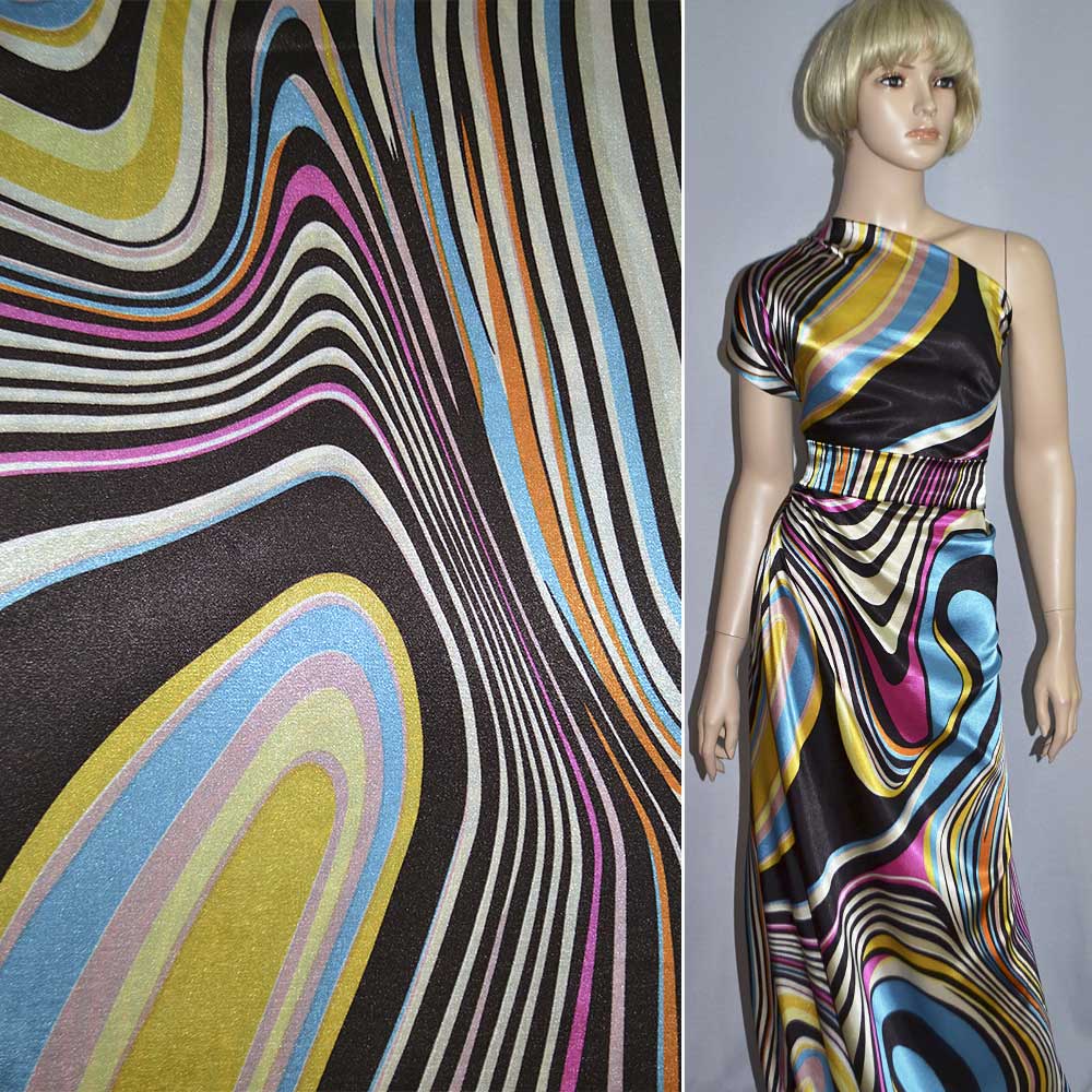 Атлас стрейч темно-коричневый в желто-голубые розовые полоски радуга ш.120 купить в розницу и оптом