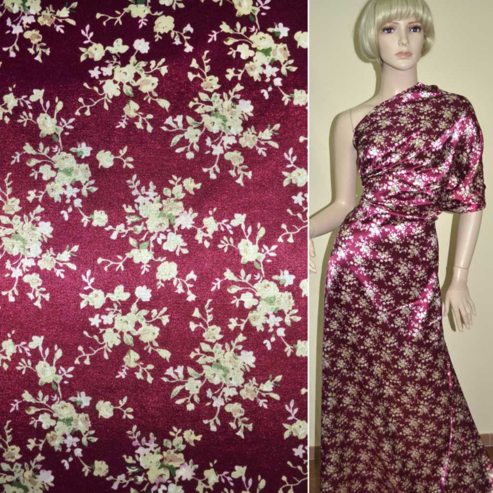 Атлас стрейч вишневый с бежевыми мелкими цветами ш.122 купить в розницу и оптом