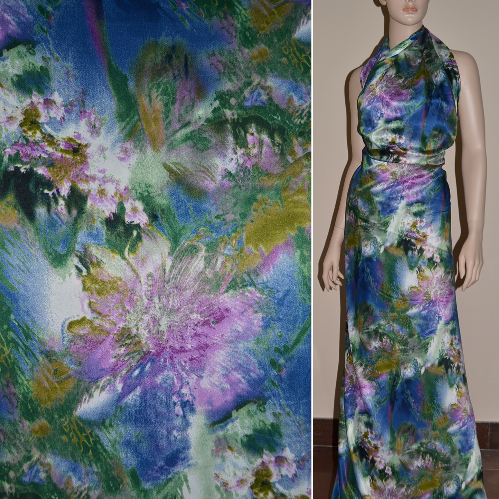 Атлас стрейч зеленый с розово-голубым абстрактным рисунком ш.120. Состав ткани: Полиэстер-97, Эластан-3. Плотность ткани: 82 г/м.кв. Страна производитель: Южная Корея. Самой популярной тканью, которая используется при пошиве свадебных и вечерних платьев, вот уже много лет является атлас. С арабского языка это слово переводится как «гладкий» и оно с точностью характеризует внешний вид этого материала. Атлас представляет собой плотную шелковую или полушелковую ткань атласного переплетения, при котором нить утка выходит на лицевую сторону через пять и более нитей основы.