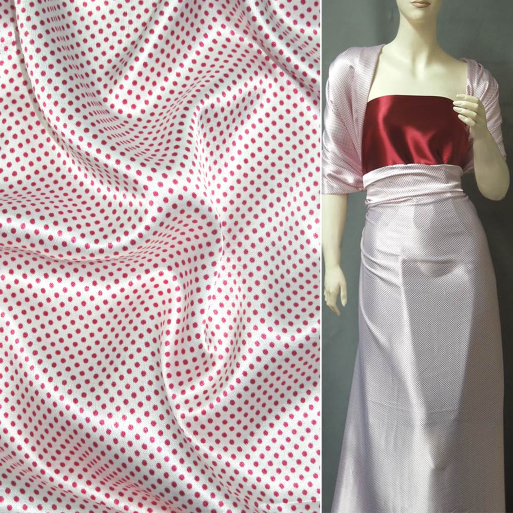 Сатин стрейч белый в мелкий красный горох ш.120. Состав ткани: Полиэстер-98, Эластан-2. Плотность ткани: 86 г/м.кв. Страна производитель: Южная Корея. Самой популярной тканью, которая используется при пошиве свадебных и вечерних платьев, вот уже много лет является атлас. С арабского языка это слово переводится как «гладкий» и оно с точностью характеризует внешний вид этого материала. Атлас представляет собой плотную шелковую или полушелковую ткань атласного переплетения, при котором нить утка выходит на лицевую сторону через пять и более нитей основы.