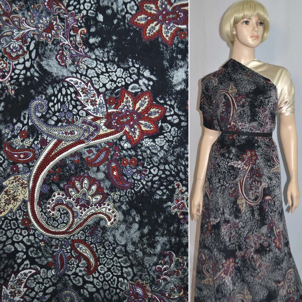 Велюр стрейч черный с бордово-серым цветочным рисунком, ш.150 купить в розницу и оптом
