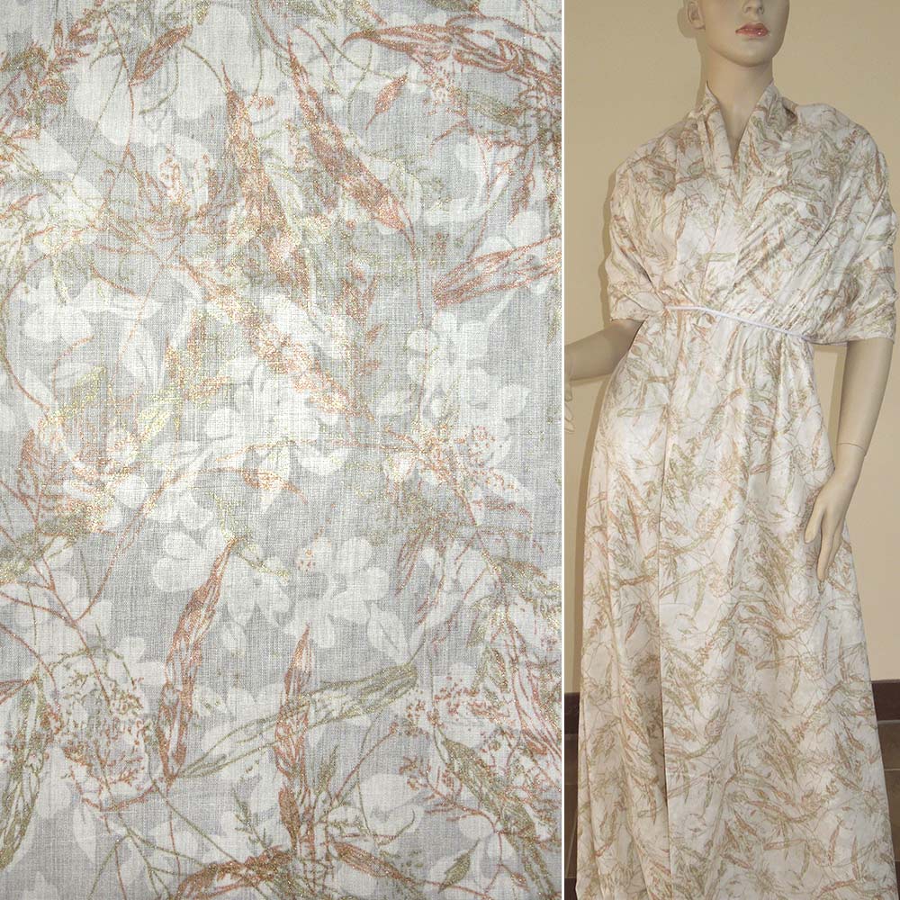 Батист бежевый светлый с золотыми и зелеными листьями деворе ш.150 купить в розницу и оптом