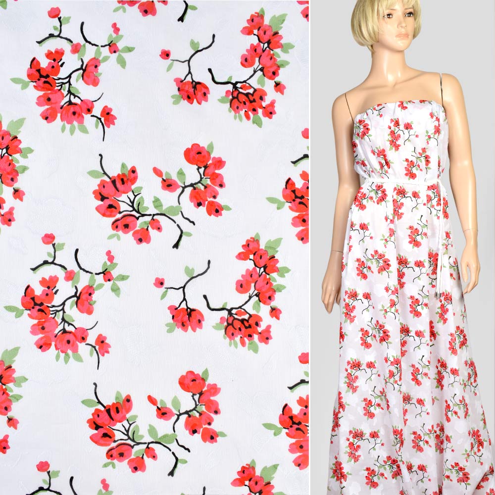 Батист деворе белый в красно-розовые цветочные ветки, ш.140. Состав ткани: Хлопок-98, Эластан-2. Плотность ткани: 95 г/м.кв. Страна производитель: Южная Корея. Ткань батист является одной из востребованных летних тканей, так как она легкая, дышащая, воздушная и гипоаллергенная. Она прекрасно подходит для пошива таких изделий как свадебные наряды, платья, сарафаны, юбки, рубашки, блузы. Батист имеет улучшенные характеристики прочности, износостойкости и отлично лежит на теле.