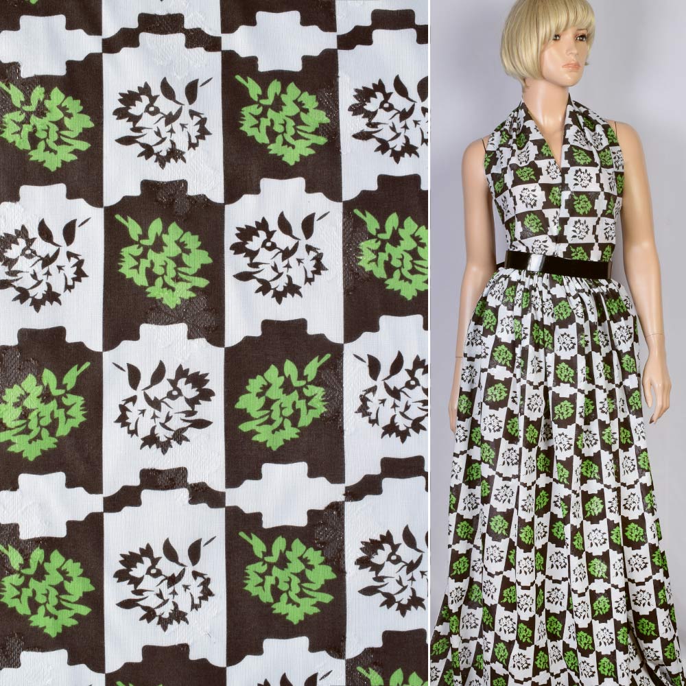 Батист деворе с метанитью коричнево-белая клетка,зеленые цветы ш.140 купить в розницу и оптом