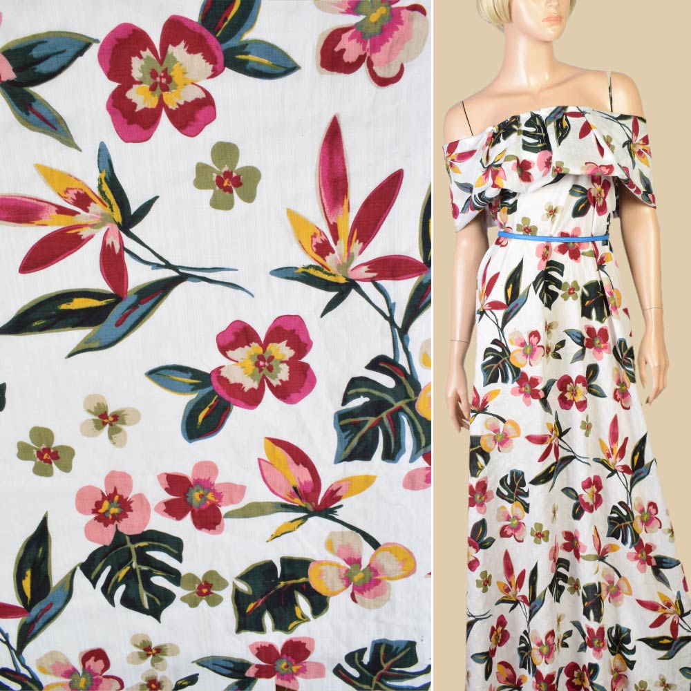 Батист белый в крупные розово-желтые цветы, зеленые листья, ш.145 купить в розницу и оптом