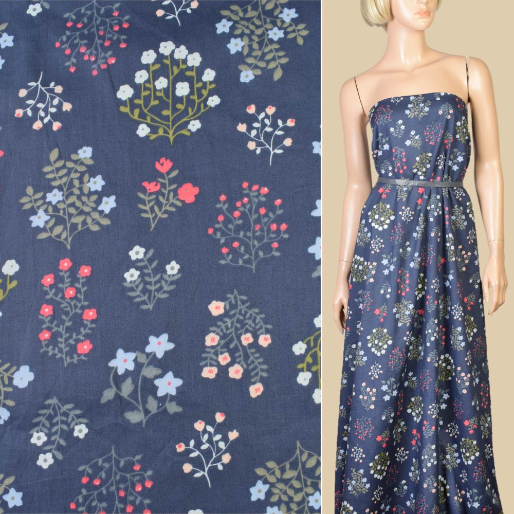 Батист синий в голубые, красные, бежевые цветущие ветки, ш.145 купить в розницу и оптом