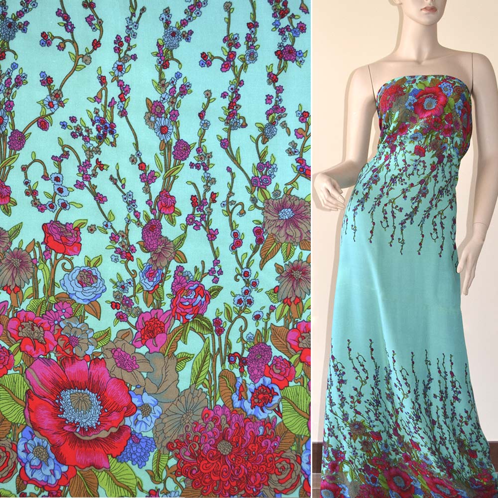 Батист зеленый светлый с двухсторонним бордово-синим купоном цветы ш.140 купить в розницу и оптом