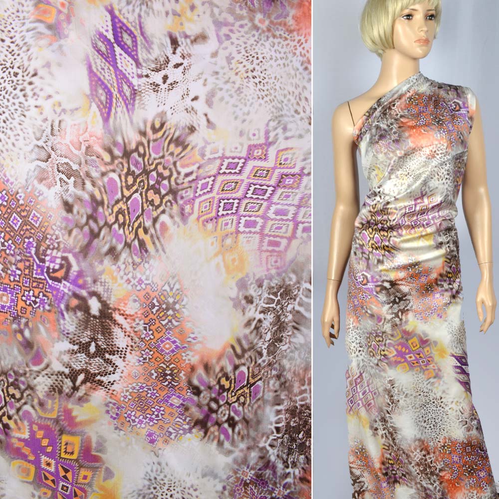Коттон-сатин "Apanage" белый в желто-персиковые, коричнево-фиолетовые принты ш.140 купить в розницу и оптом