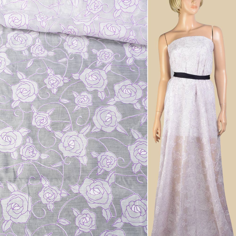Батист с органзой белый с фиолетовыми розами ш.145 купить в розницу и оптом
