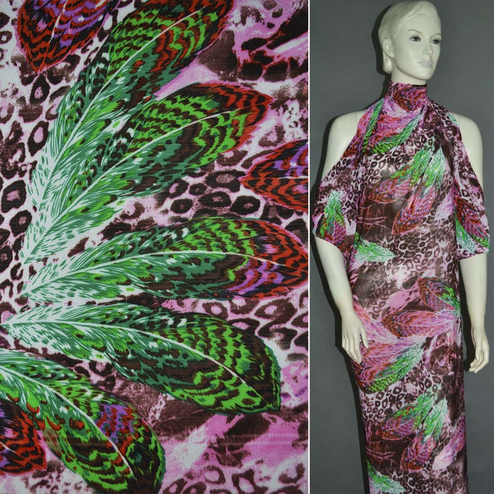 Микролайкра розово-коричневая с цветными перьями ш.160 купить в розницу и оптом