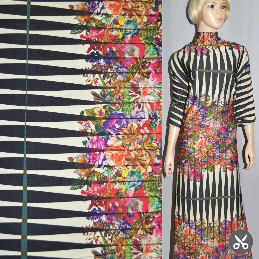Трикотаж вискозный джерси молочный с черными стрелами и цветочным купоном ш.150 купить в розницу и оптом