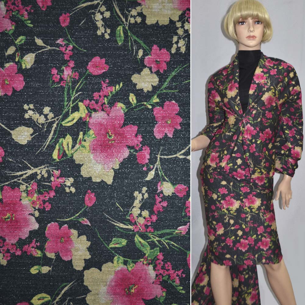 Трикотаж джерси черный с малиновыми цветами с блестками ш.152 купить в розницу и оптом