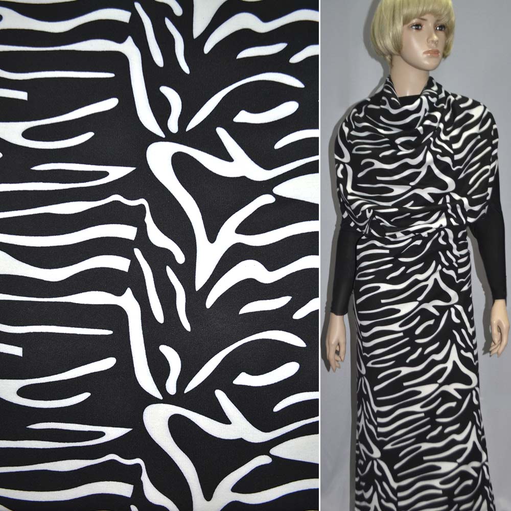 Трикотаж французский черный с белым принтом зебра ш.148. Состав ткани: Вискоза-25, Полиамид-35, Полиэстер-35, Эластан-5. Плотность ткани: 286 г/м.кв. Страна производитель: Южная Корея. Трикотаж - это мягкая плотная материя, не прозрачная. Приятная на ощупь, комфортная в носке. Благодаря содержанию синтетических материй, материал более износостойкий и надолго сохраняет свой первоначальный вид. Ткань отличается своей приятной текстурой, хорошей растяжимостью, практически не мнется, хорошо драпируется. Трикотаж достаточно простой в уходе. Используется для пошива платьев, спортивных костюмов, легких жакетов, поло, футболок и многого другого.