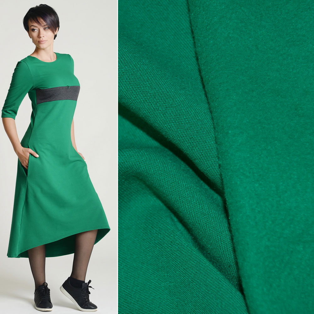 Трикотаж на флисе зелено-бирюзовый ш.160. Состав ткани: Полиэстер-30, Полиэфир-70. Плотность ткани: 280 г/м.кв. Страна производитель: Южная Корея. Трикотаж - это мягкая плотная материя. Лицевая сторона гладкая трикотажная, изнаночная флисовая. Приятная на ощупь, комфортная в носке. Благодаря содержанию синтетических материй, материал более износостойкий и надолго сохраняет свой первоначальный вид. Ткань отличается своей приятной текстурой, хорошей растяжимостью, практически не мнется. Трикотаж достаточно простой в уходе. Используется для пошива платьев, спортивных костюмов, легких жакетов, поло, футболок и многого другого.