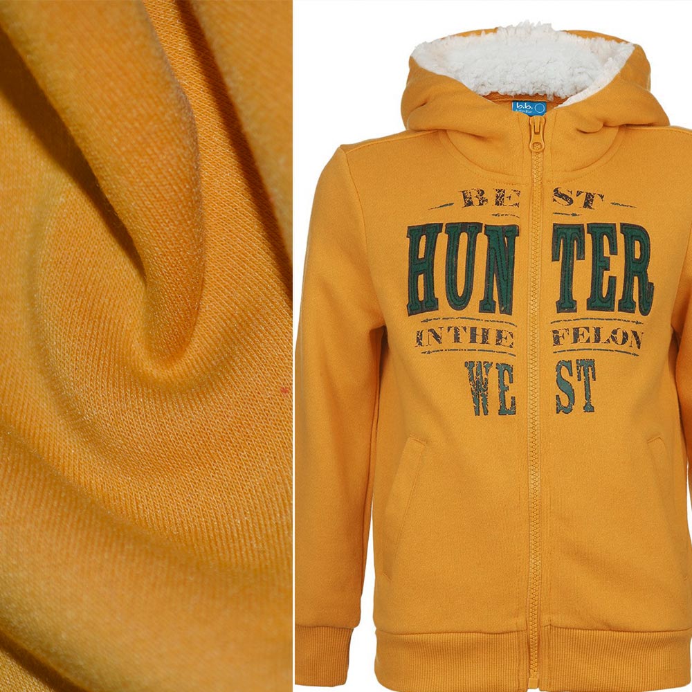 Трикотаж на флисе желтый ш.160. Состав ткани: Полиэстер-30, Полиэфир-70. Плотность ткани: 280 г/м.кв. Страна производитель: Южная Корея. Трикотаж - это мягкая плотная материя. Лицевая сторона гладкая трикотажная, изнаночная флисовая. Приятная на ощупь, комфортная в носке. Благодаря содержанию синтетических материй, материал более износостойкий и надолго сохраняет свой первоначальный вид. Ткань отличается своей приятной текстурой, хорошей растяжимостью, практически не мнется. Трикотаж достаточно простой в уходе. Используется для пошива платьев, спортивных костюмов, легких жакетов, поло, футболок и многого другого.
