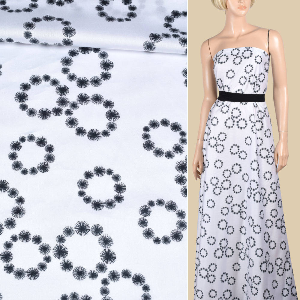 Коттон атласный белый в черные венки из одуванчиков ш.145. Состав ткани: Хлопок-100. Плотность ткани: 82 г/м.кв. Страна производитель: Германия. Материал очень легкий, дышащий, не дающий телу потеть или мерзнуть. Именно благодаря высоким гигиеническим свойствам пользуется большой популярностью. Коттон не прихотливый в уходе, мягкий и гипоаллергенный. Благодаря плотности подходит для пошива летних костюмов, платье, брюк и юбок. Хлопок не электризуется, не скрипит, в отличии от синтетических тканей. Используется для пошива одежды, постельного и нижнего белья.