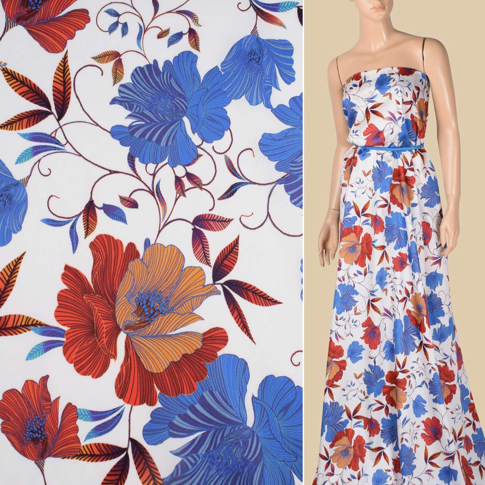 Коттон белый, синие, оранжево-желтые цветы, ш.145 купить в розницу и оптом