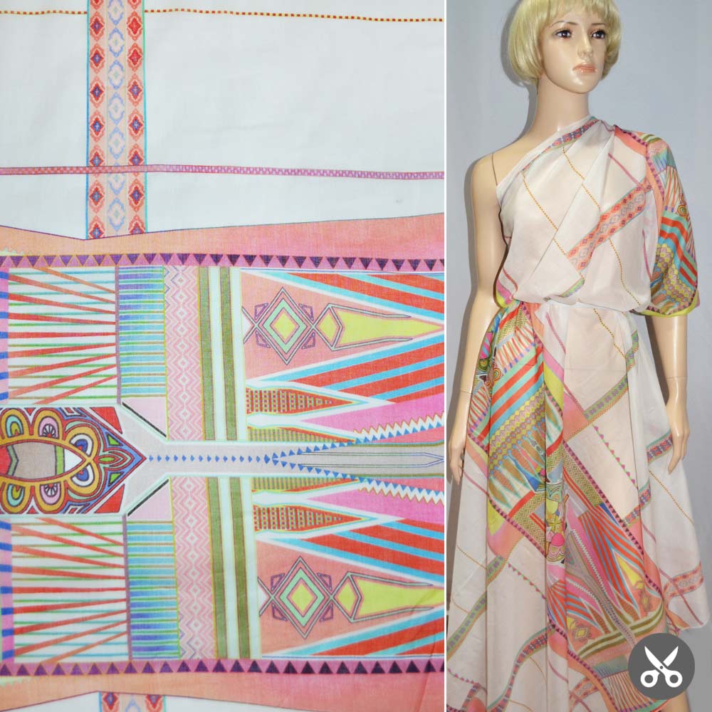 Коттон молочный с разноцветным геометрическим рисунком раппорт ш.135. Состав ткани: Хлопок-100. Плотность ткани: 47 г/м.кв. Страна производитель: Германия. Материал очень легкий, дышащий, не дающий телу потеть или мерзнуть. Именно благодаря высоким гигиеническим свойствам пользуется большой популярностью. Коттон не прихотливый в уходе, мягкий и гипоаллергенный. Благодаря плотности подходит для пошива летних костюмов, платье, брюк и юбок. Хлопок не электризуется, не скрипит, в отличии от синтетических тканей. Используется для пошива одежды, постельного и нижнего белья.