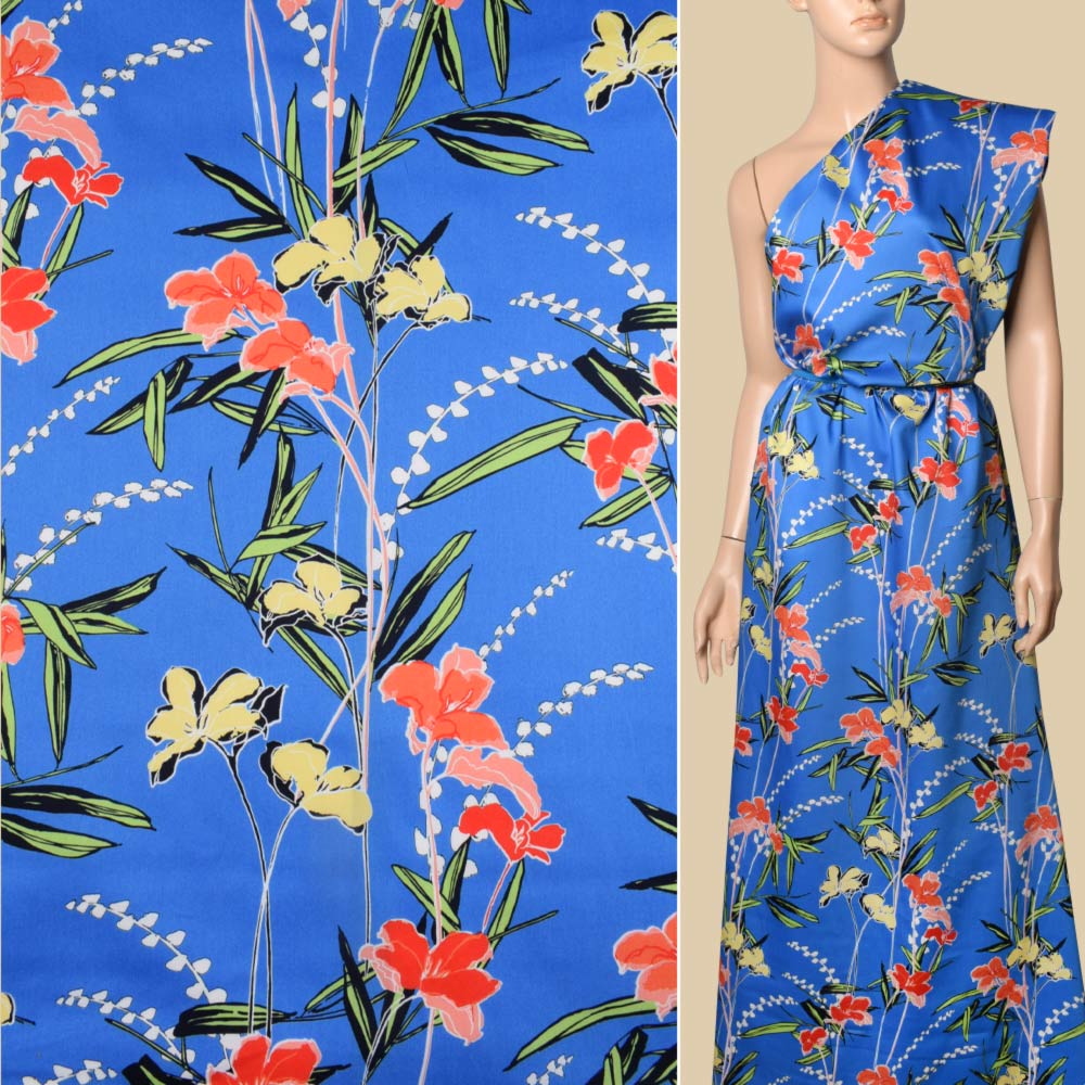 Коттон синий, кремовые, красно-оранжевые цветы, ш.140. Состав ткани: Хлопок-100. Плотность ткани: 91 г/м.кв. Страна производитель: Германия. Материал очень легкий, дышащий, не дающий телу потеть или мерзнуть. Именно благодаря высоким гигиеническим свойствам пользуется большой популярностью. Коттон не прихотливый в уходе, мягкий и гипоаллергенный. Благодаря плотности подходит для пошива летних костюмов, платье, брюк и юбок. Хлопок не электризуется, не скрипит, в отличии от синтетических тканей. Используется для пошива одежды, постельного и нижнего белья.