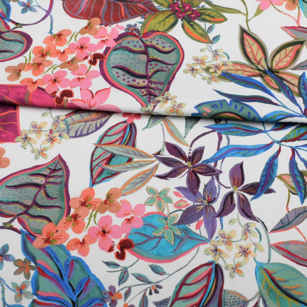 Коттон стрейч APANAGE белый, розовые, синие цветы, листья, ш.135 купить в розницу и оптом