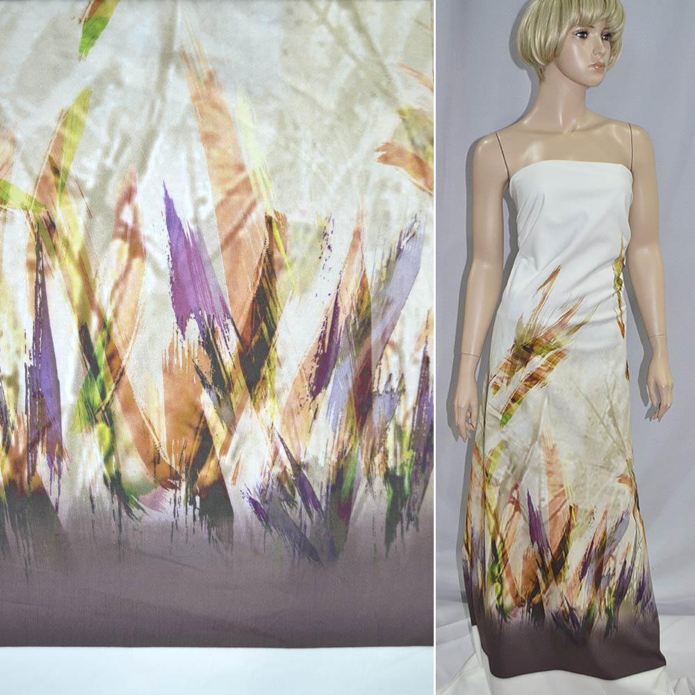 Коттон стрейч белый с песочно-желтым абстрактным рисунком ш.150. Состав ткани: Хлопок-98, Эластан-2. Плотность ткани: 285 г/м.кв. Страна производитель: Германия. Коттон — прочный, легкий, мягкий материал, он легко впитывает влагу, хорошо пропускает воздух, обладает высокой теплопроводностью.