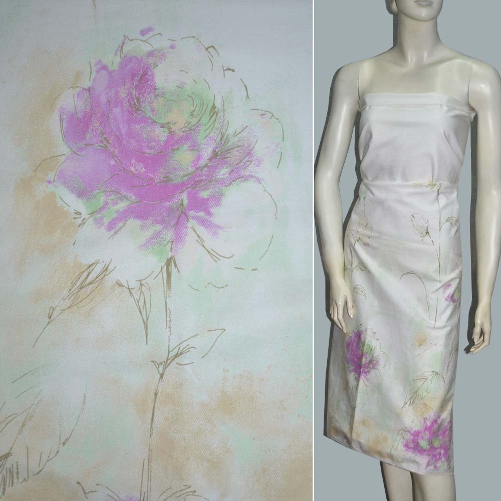 Коттон стрейч белый с салатным оттенком и розовыми цветами. Состав ткани: Хлопок-97, Эластан-3. Плотность ткани: 180 г/м.кв. Страна производитель: Германия. Коттон — прочный, легкий, мягкий материал, он легко впитывает влагу, хорошо пропускает воздух, обладает высокой теплопроводностью.