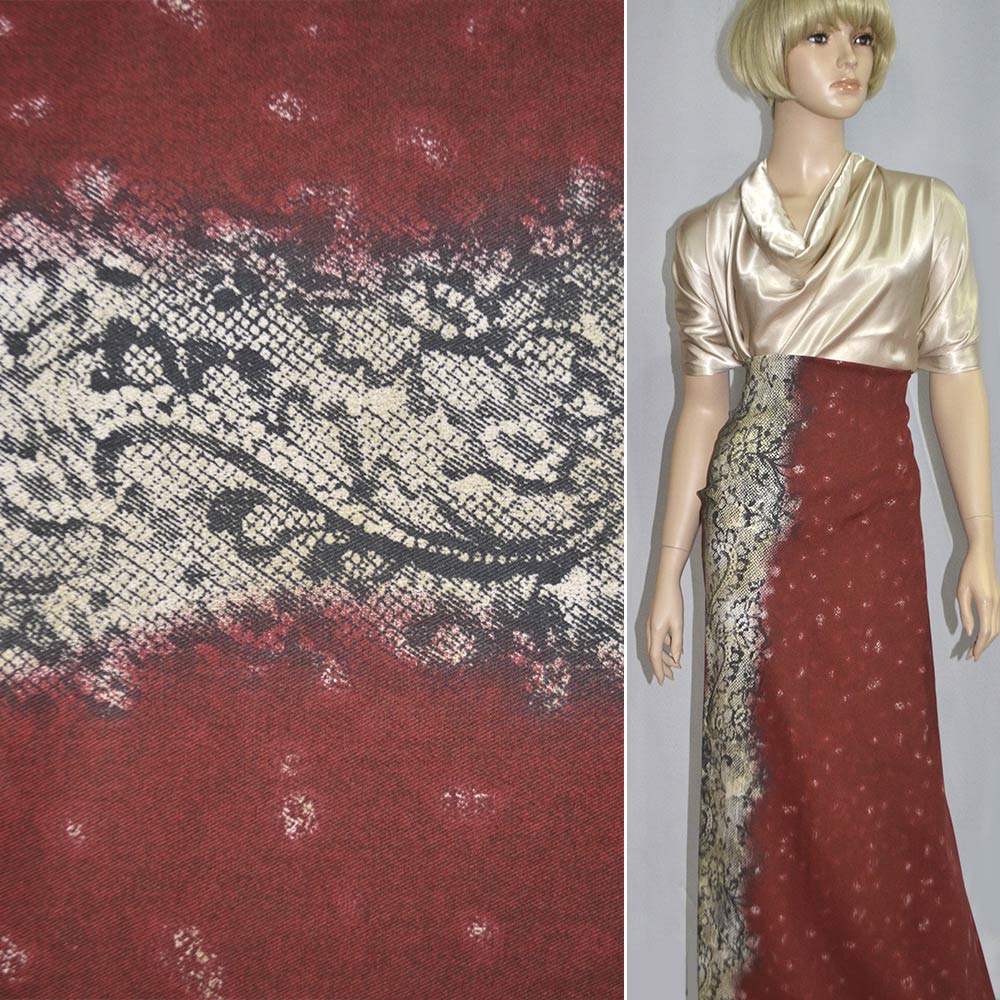 Коттон стрейч коричневый с кружевным принтом ш.145. Состав ткани: Хлопок-98, Эластан-2. Плотность ткани: 201 г/м.кв. Страна производитель: Германия. Коттон — прочный, легкий, мягкий материал, он легко впитывает влагу, хорошо пропускает воздух, обладает высокой теплопроводностью.