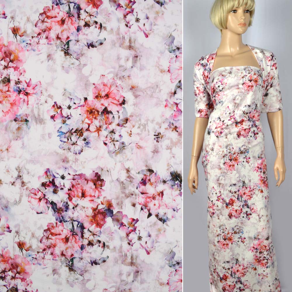 Коттон стрейч в рубчик белый в розово-фиолетовые цветы ш.145 купить в розницу и оптом