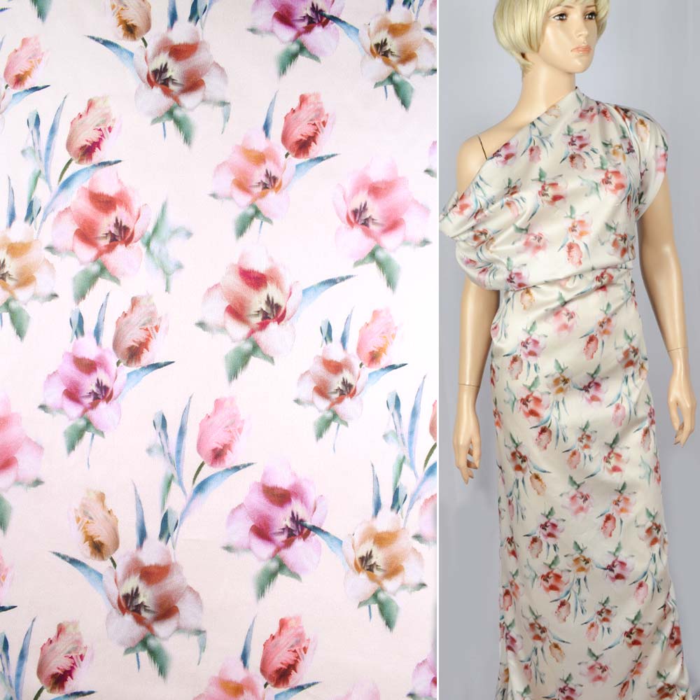 Коттон сатин молочный в розово-зеленые тюльпаны ш.141 купить в розницу и оптом