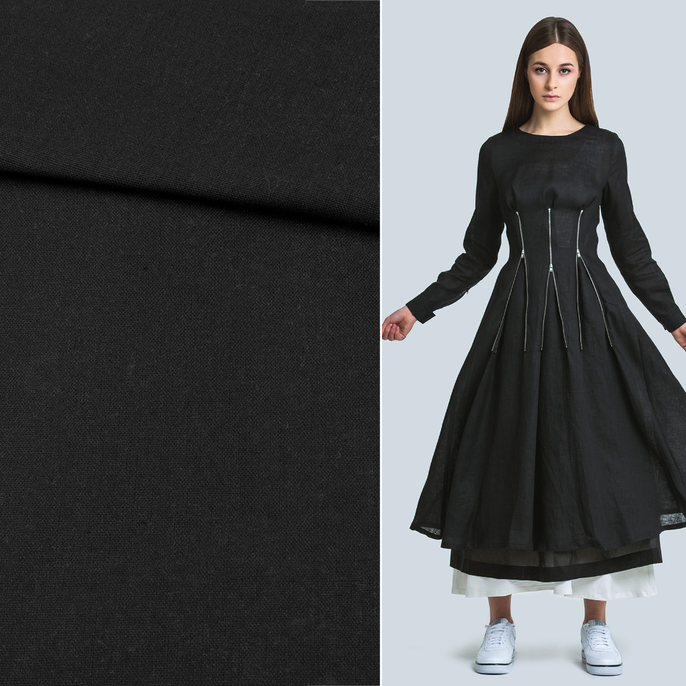 Лен черный ш.145. Состав ткани: Лён-70, Хлопок-30. Плотность ткани: 184 г/м.кв. Страна производитель: Южная Корея. Лен - материал средней плотности, натурального происхождения, используется для пошива летних изделий. Гигроскопичный, воздухопроницаемый, прочный, устойчив к носке, стирке и глаженью. Поверхность ткани матовая, а благодаря хлопку в составе, тактильно очень мягкая и приятная на ощупь, непрозрачна. В складках и сборках не имеет значительного формообразования, ложится мягко и пластично. Подходит для пошива брючных костюмов свободного кроя, пиджаков, платьев, юбок, сарафанов, рубашек.