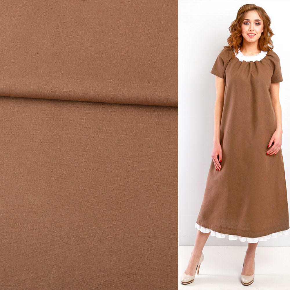 Лен коричневый цвета корицы ш.140. Состав ткани: Лён-70, Хлопок-30. Плотность ткани: 170 г/м.кв. Страна производитель: Южная Корея. Лен - материал средней плотности, натурального происхождения, используется для пошива летних изделий. Гигроскопичный, воздухопроницаемый, прочный, устойчив к носке, стирке и глаженью. Поверхность ткани матовая, а благодаря хлопку в составе, тактильно очень мягкая и приятная на ощупь, непрозрачна. В складках и сборках не имеет значительного формообразования, ложится мягко и пластично. Подходит для пошива брючных костюмов свободного кроя, пиджаков, платьев, юбок, сарафанов, рубашек.