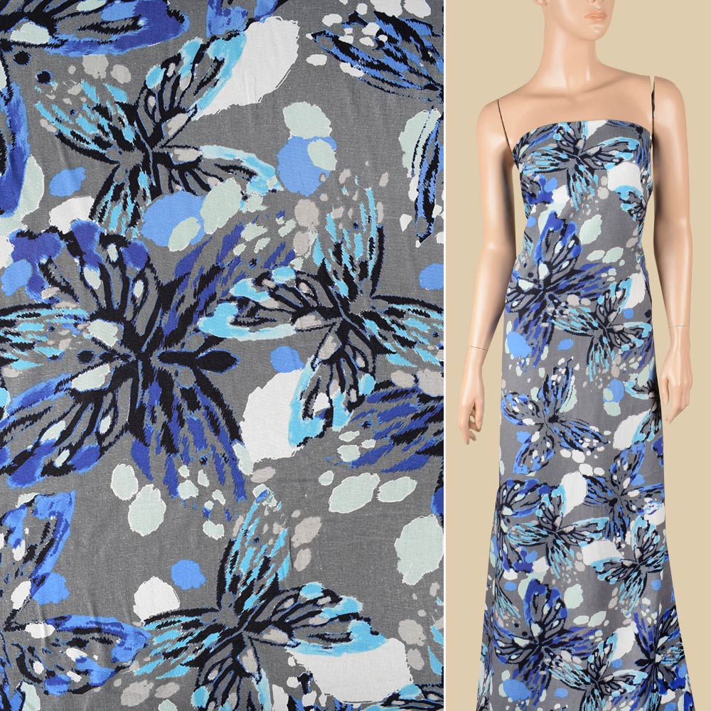 Лен серый, голубые, синие бабочки, цветные пятна, ш.138 купить в розницу и оптом