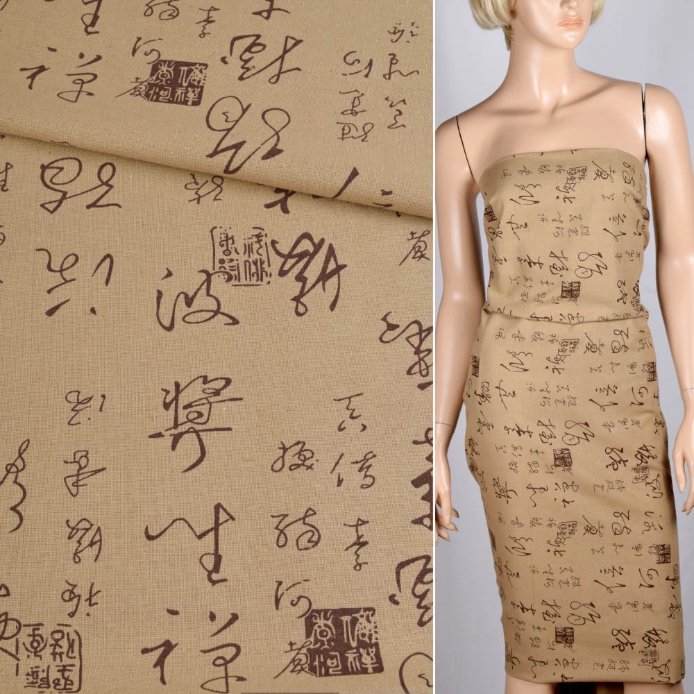 Лен бежевый темный с коричневыми иероглифами ш.150 купить в розницу и оптом